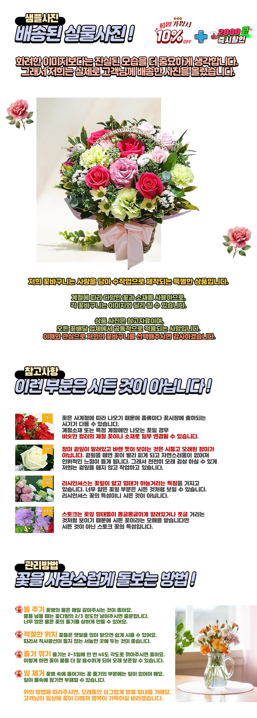 가끔 원하시는 꽃 대신 비슷한 색상의 제철 꽃으로 변경되어 배송될 수 있어요.